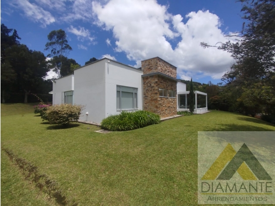se renta hermosa casa campestre en la ceja con un area de 390m2 construids y un lote de 9800m2 distribuidos en una amplia sala comedor con chimenea,cocina integral con isla zona de ropas,cuarto del servicio con baño y closet privado,3 habiatciones con su recpectivo vestier y baños priavado,comedor auxiliar,sala de estar y una amplia zona verde con arboles frutales,cuenta con vigilancia 24/7.